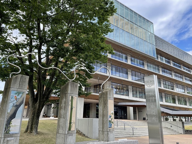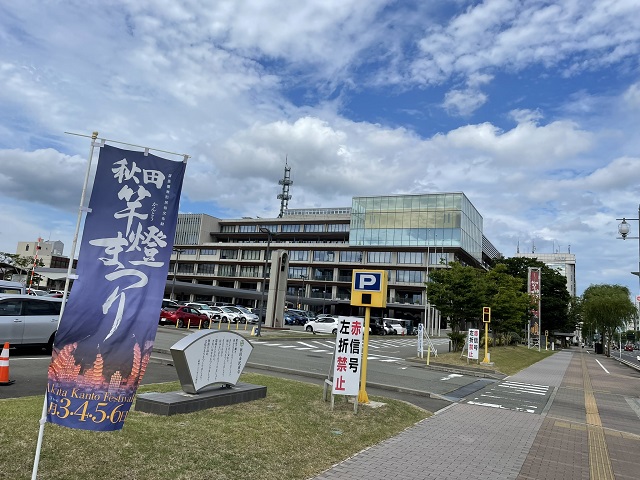 市役所。綺麗な庁舎は羨ましいすね。竿灯まつりが翌週に迫っており、竿灯が道路の真ん中に突き刺さっていた。