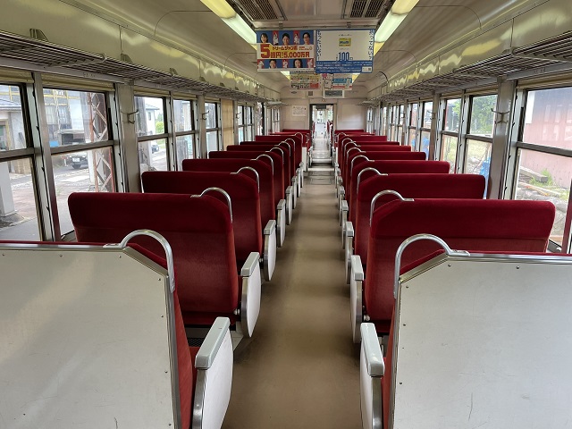 深紅の転換式クロスシートが並ぶ車内をほぼ独り占めで撮影できた。