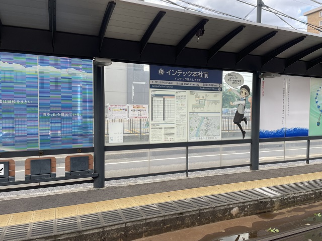 インテック本社前駅。上り下りできちんと電停が整備されていて、しかも綺麗。企業協賛が入っているので費用が賄われているのだろうか。